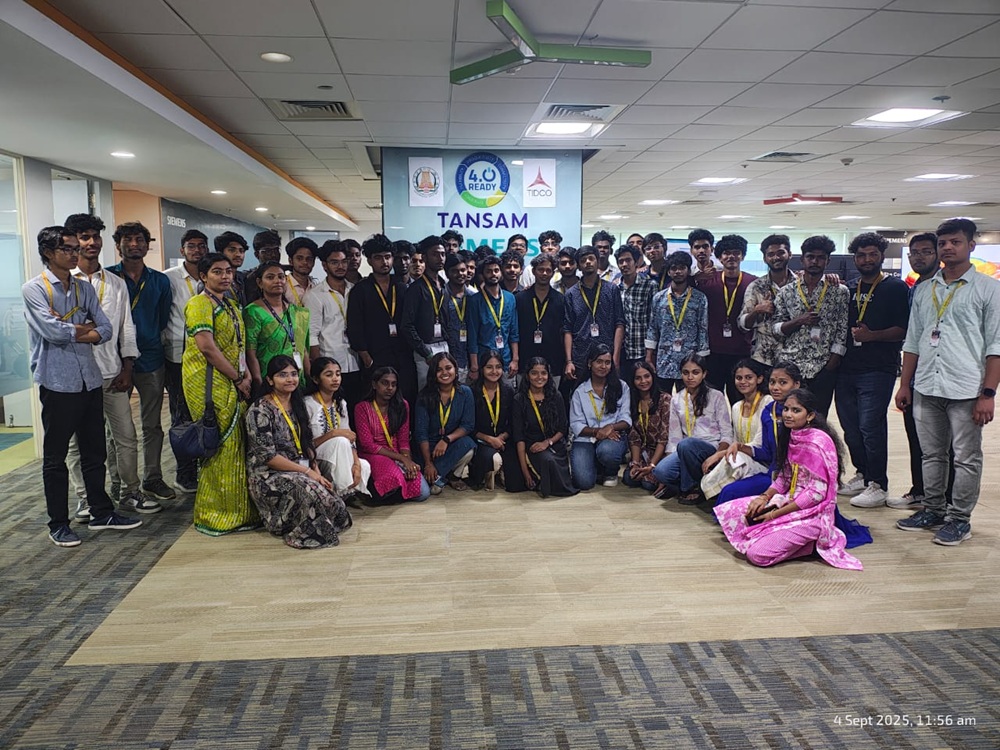 On September 4, 2025, 49 second-year B.E. (CSE) students and two faculty members went on an industrial visit to the TANSAM (Tamil Nadu Smart and Advanced Manufacturing Centre). The visit began at 10:45 AM with a welcome and an overview of TANSAM's mission to upskill the manufacturing workforce. Students toured specialized labs, including those for Predictive Analytics, Smart Factory, and AR/VR/MR Research. They also participated in hands-on demonstrations of technologies like collaborative robotics (cobots), AR/VR medical simulations, and automation systems.