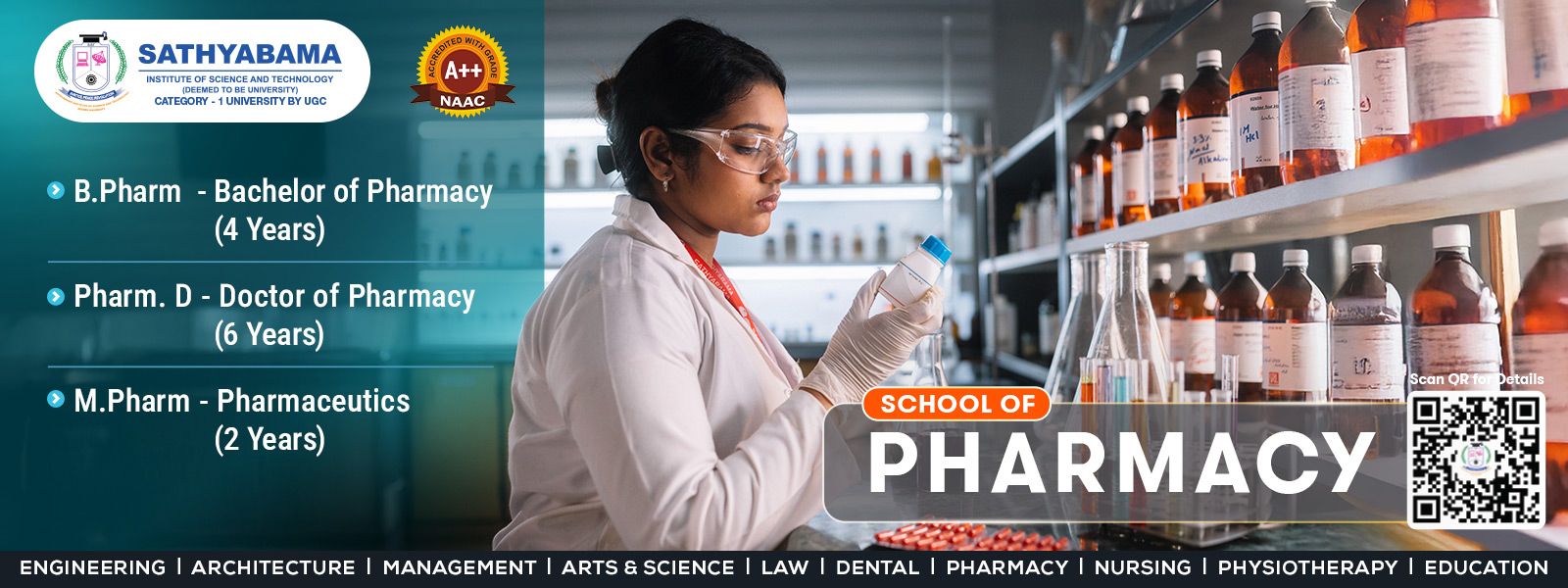 The School of Pharmacy is been approved by the Pharmacy Council of India, All India Council of Technical Education and University Grants Commission. The school started its first batch in the academic year of 2019-20. The school has 6 modern classrooms, 13 modular laboratories with sophisticated instruments. The school is attached to the general hospital which is situated in the campus of Sathyabama Institute of Science and Technology. Pharmacy School has well-qualified, foreign-trained skilful professional teaching professors with a doctorate or post-graduation degrees. School of Pharmacy motivates and encourages the faculty members to actively participate in research activities.