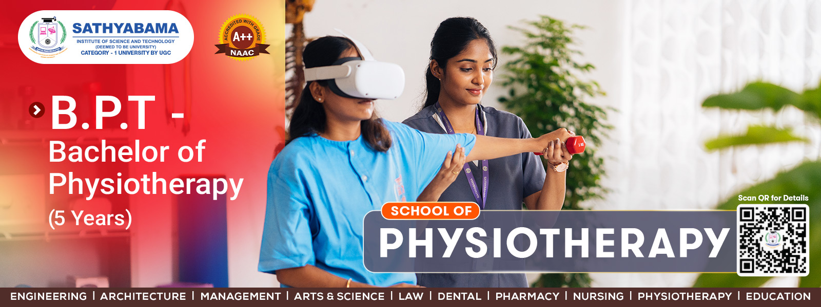 Sathyabama College of Physiotherapy, was established in 2022, by Chancellor Dr. Mariazeena Johnson with the aim of producing future Physiotherapists of our country with a service to society and broad scientific knowledge required for Physiotherapists. The school of Physiotherapy offers undergraduate course with a duration of four and a half years. We aim at up-to-date physiotherapy education which could correspond to requirements & changes in the times. The school is attached to the general hospital is situated in the Sathyabama Institute of Science and Technology. Physiotherapy School has well-qualified, skillful professional teaching faculties with a doctorate or post-graduation degrees. School of Physiotherapy motivates and encourages the faculty and students to actively participate in research activities.