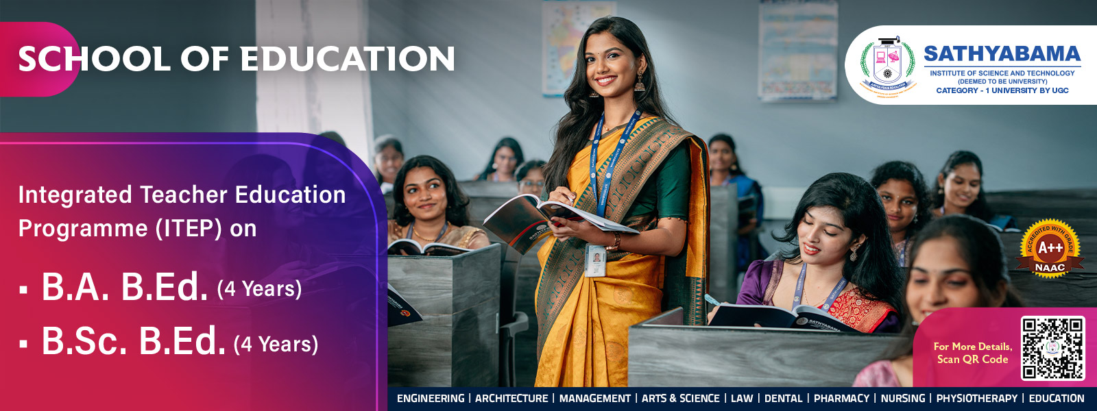 The School of Education, Sathyabama Institute of Science and Technology started in the year 2025. The programmes offered by the school are duly approved by the National Council for Teacher Education (NCTE), New Delhi. The school offers Four Year Integrated Teacher Education Programmes (ITEP). The School offers B.A. B.Ed. (Four Years) and B.Sc. B.Ed. (Four Years) in Science and Humanities specializations.