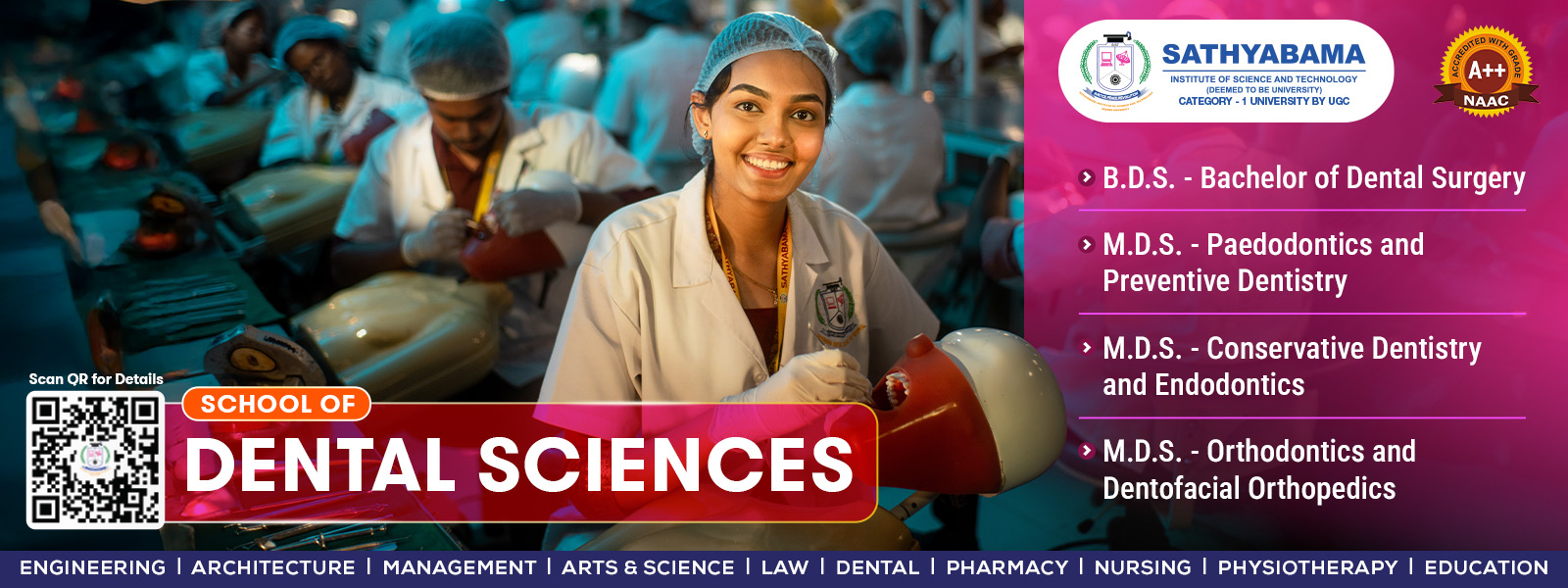 Sathyabama Dental College and Hospital, was established in 2009 under the vision of our Founder Chancellor Dr. Jeppiaar MA.BL, Ph.D.,.Sathyabama Dental College and Hospital was established as  the only private autonomous Dental Institution in the nation  accredited by the Dental Council of India in 2014 for awarding Bachelor of Dental Surgery (BDS) degree. His visionary of including Postgraduate curriculum had instigated three specialities in Masters of Dental Surgery namely Orthodontics and Dentofacial Orthopedics, Pedodontics and Preventive Dentistry, Conservative Dentistry and EndodonticsOur institution is ranked 39th in list of universities in India. It is accredited with “A++” grade by NAAC and is certified by ISO. Our campus located at Old Mahabalipuram Road aims to provide health education and medical facilities to the all.Sathyabama Dental College and Hospital extends comprehensive health care to the unreachable at their door step through Peripheral Health Centres at Government Primary Health Centres.Our institution houses tobacco cessation centre to promote awareness among the public about its ill effects.Sathyabama Dental College and Hospital is committed to provide global par excellence in dental education and research to our undergraduate and postgraduate students by providing global infrastructure facilities and amenities beyond the requirements of Dental Council of India.