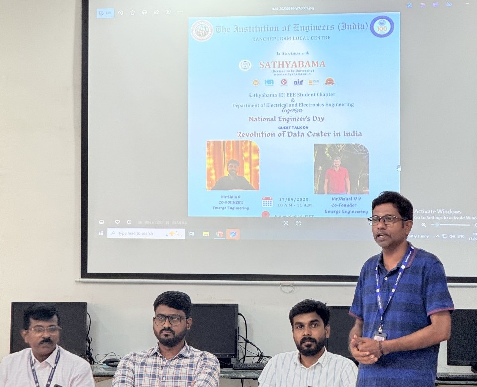 IE(I) EEE Student Chapter The Department of Electrical and Electronics Engineering, Sathyabama Institute of Science and Technology, in association with IE(I) Kancheepuram Local Centre, celebrated National Engineers’ Day with a guest lecture on “Revolution of Data Center in India.” Eminent speakers shared insights, enriching students with knowledge on emerging technologies and industry perspectives.