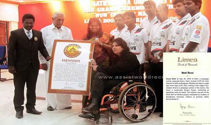 Deepa Malik from Delhi is a paraplegic woman, is paralyzed below her chest. She made the longest four-wheeler drive by a paraplegic woman in the country. She drove a customized Renault Duster, which was solely controlled by hands from Chennai-Delhi via Bangalore, Mumbai and Jaipur by road which covered 3,278kms and lasted for 8 days (Sep 22-29,2013). The initiative was part of The WoW (Will on Wheels) project crew of students from Satyabhama University, Chennai, India.